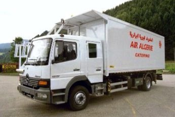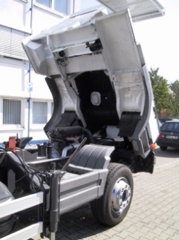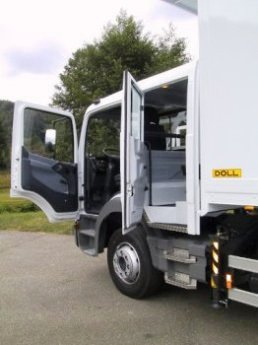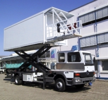 Mit diesem Fahrerhausumbau zum "Halbschnittfahrzeug" bietet die Firma Eller eine Problemlösung für den Catering− und Rollstuhltransport im Flugvorfeld an. Bei dieser Fahrerhausänderung bleibt der gesamte Funktionsumfang des Fahrgestells erhalten. |