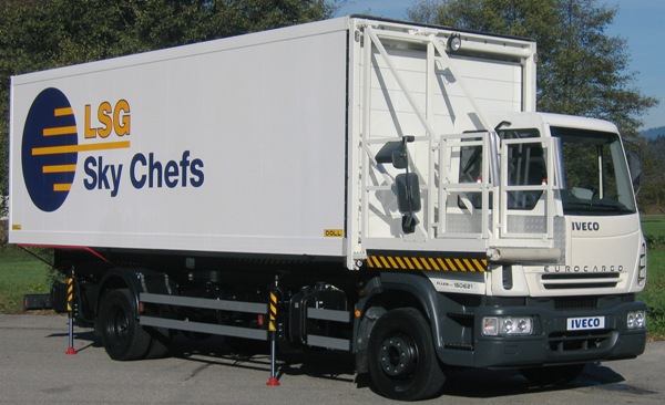 Mit diesem Fahrerhausumbau zum "Halbschnittfahrzeug" bietet die Firma Eller eine Problemlösung für den Catering− und Rollstuhltransport im Flugvorfeld an. Bei dieser Fahrerhausänderung bleibt der gesamte Funktionsumfang des Fahrgestells erhalten. |